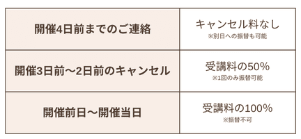 キャンセルをご希望の場合は、開催日の4日前までに必ずご連絡ください。