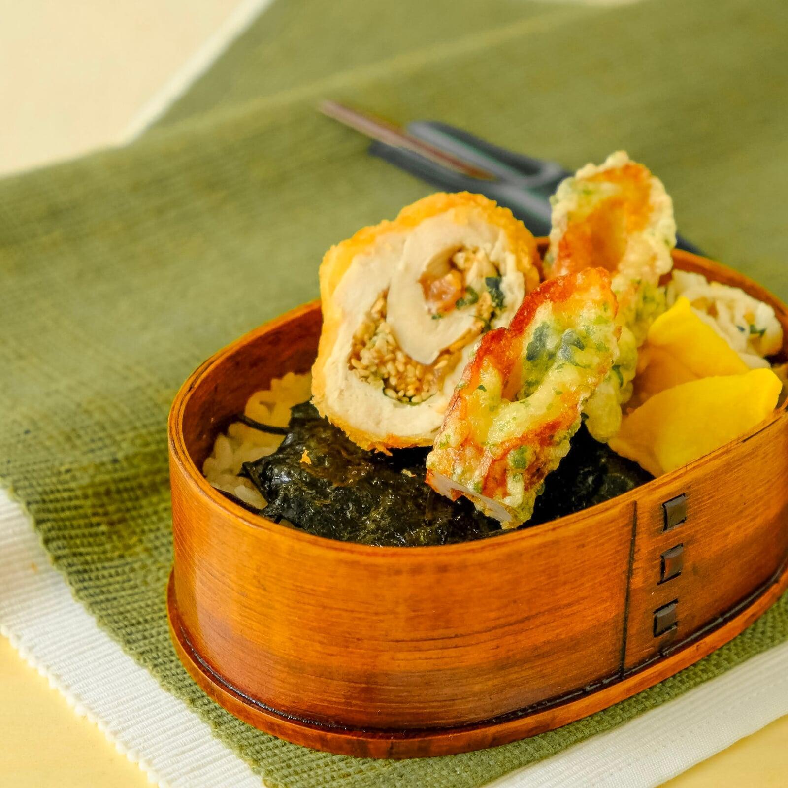 Nori Bento includes fried chikuwa (fish cake) wrapped in seaweed, fried chicken fillet with plum, and grilled salmon seasoned with salt and koji.